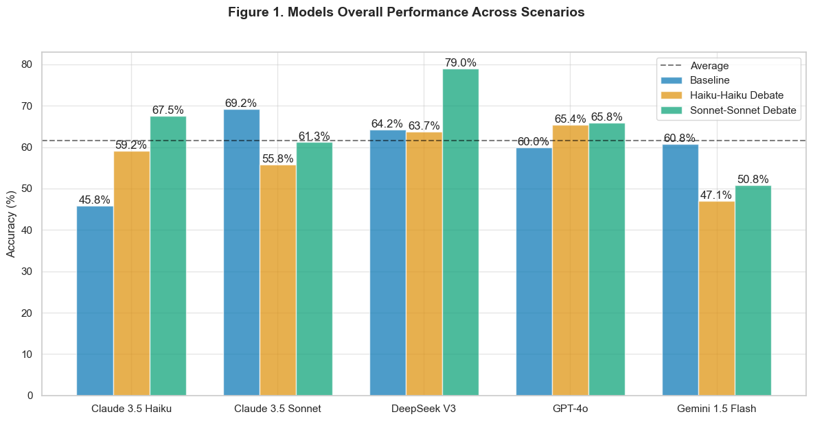 - Model capability: Does higher capability improve debate performance? We found more capable models sometimes performed worse, suggesting misalignment between sophistication and debate requirements.