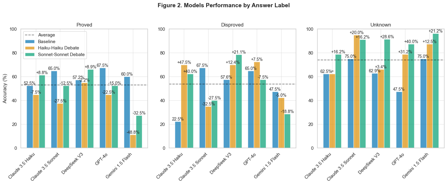 The configuration of stronger debaters than judges—represented by Haiku judging Sonnet-Sonnet debates—yields our most substantial performance improvements (+21.7%, p < 0.001). This finding particularly matters for AI safety, as it suggests that relatively simple oversight mechanisms might effectively evaluate more sophisticated systems’ reasoning—at least within the confined scope of our experimental setup.