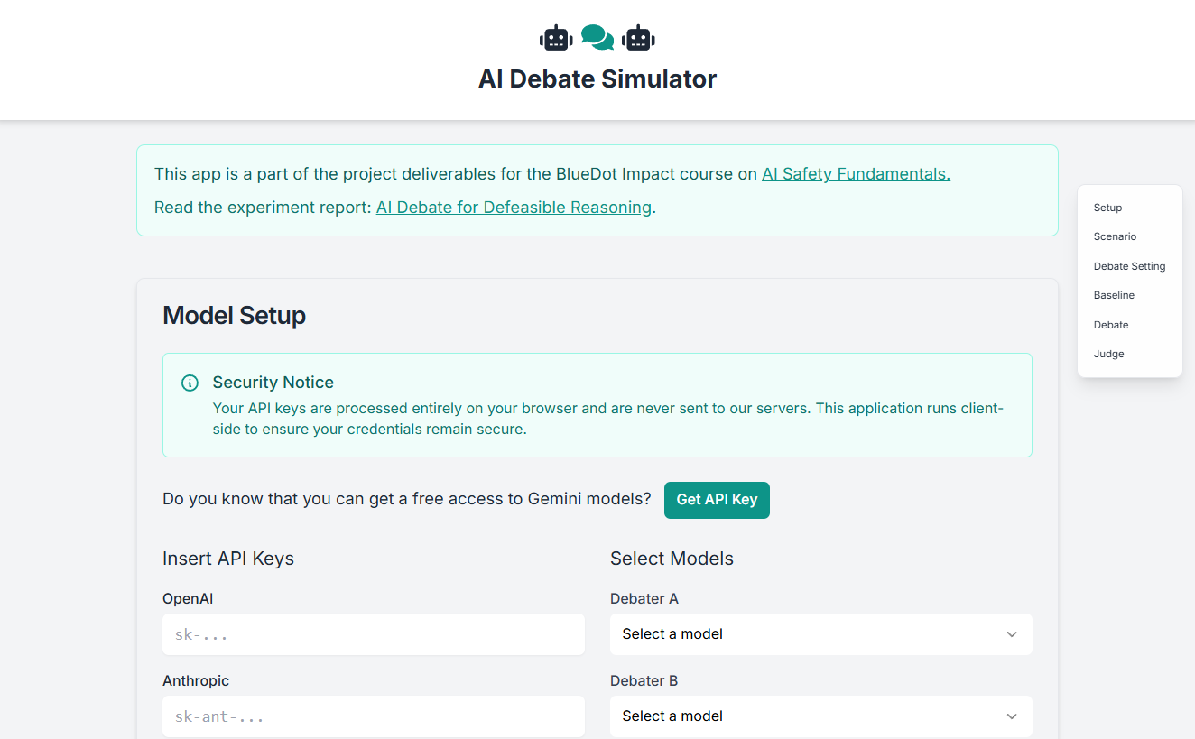 To facilitate further exploration of AI debate dynamics, I’ve developed a web application that allows you to simulate the debate process using your own LLM services (supporting common providers like Anthropic, OpenAI, etc.). The app will also includes a mode where you can examine the baseline responses, debates, and judgments generated during this research project (coming soon!).
